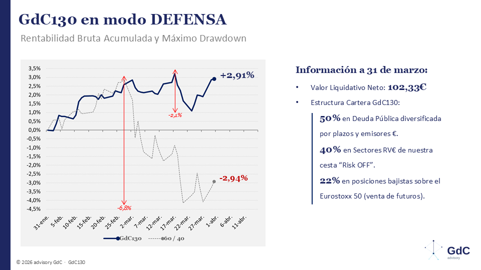 El Valor Liquidativo Neto de la Cartera GdC130 cierra el 31 de marzo en 102,33€, sumando una Rentabilidad Bruta Acumulada del +2,91% desde el inicio de las operaciones el 31 de enero de 2026. En ese mismo período el índice de referencia —cartera 60/40— acumula una pérdida del -2,94%.